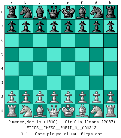 Last move : 0-1 2018 April 10 20:48:9 [Event "FICGS__CHESS__RAPID_A__000212"] [Site "FICGS"] [Date "2018.03.11"] [Round "1"] [White "Jimenez,Martin"] [Black "Cirulis,Ilmars"] [Result "0-1"] [WhiteElo "1900"] [BlackElo "2037"] 0-1 This chess game has been lost on time (started : 2018.03.11 15:16:55) Player Black won this chess game. Follow this game move after move (download)My style is somewhere between that of Tal and Petrosian. (Reshevsky) Ich hatte Zahnschmerzen im ersten Spiel. In der zweiten Partie tat mir der Kopf weh. In der dritten war es eine Rheuma-Attacke und während der vierten fühlte ich mich nicht gut. Und in der fünften? Nun, man muss doch nicht jedes Spiel gewinnen, oder? (Savielly Grigorievitsch Tartakower) El Ajedrez no es una pizca de inferior al violín, y tenemos un gran número de violinistas profesionales. (Mikhail Botvinnik) Si je n'étais pas joueur d'échecs, je serais le meilleur dans quelque chose d'autre. (Anatoli Karpov) Ah, the Socrating method. The best way we have of teaching everything-apart from juggling chainsaws. (Gregory House, House M.D.)