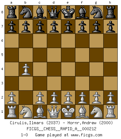 Last move : 1-0 2018 April 10 20:48:9 [Event "FICGS__CHESS__RAPID_A__000212"] [Site "FICGS"] [Date "2018.03.11"] [Round "1"] [White "Cirulis,Ilmars"] [Black "Hornr,Andrew"] [Result "1-0"] [WhiteElo "2037"] [BlackElo "2000"] 1.b4 1-0 This chess game has been lost on time (started : 2018.03.11 15:16:55) Polish (Sokolsky) opening Player White won this chess game. Follow this game move after move (download)Chess is a matter of delicate judgment, knowing when to punch and how to duck. (Bobby Fischer) Man kann eine Schachpartie nur gewinnen, wenn das Gleichgewicht gestört ist. In einer Stellung mit ungestörtem Gleichgewicht ist auch das größte Genie hilflos - in der Stellung steckt dann eben kein genialer Einfall. (Wilhelm Steinitz) En la perfecta combinación de Ajedrez como en una historia corta de primera clase, toda la trama y contra trama deberá conducir hacia un final sorprendente, el interes no es mitigado hasta el último momento. (Yates and Winter) L'attaque fait le spectacle, la défense gagne les matchs. (Dicton footballistique) Hold em is to stud what chess is to checkers. (Johnny Moss)