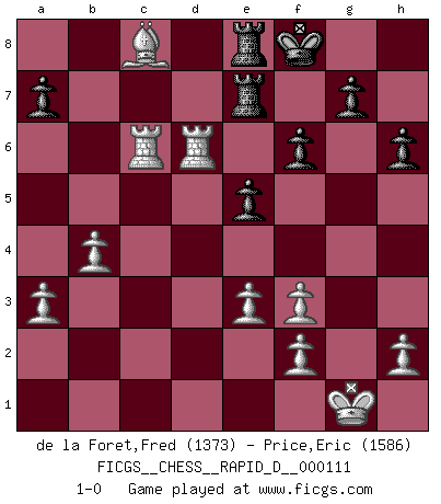 Last move : 1-0 2018 May 6 21:32:3 [Event "FICGS__CHESS__RAPID_D__000111"] [Site "FICGS"] [Date "2018.03.12"] [Round "1"] [White "de la Foret,Fred"] [Black "Price,Eric"] [Result "1-0"] [WhiteElo "1373"] [BlackElo "1586"] 1.d4 Nf6 2.c4 e6 3.Nc3 Bb4 4.Bd2 O-O 5.e3 d5 6.Nf3 c5 7.a3 Bxc3 8.Bxc3 Ne4 9.Rc1 Nxc3 10.Rxc3 cxd4 11.Qxd4 Nc6 12.Qh4 Qxh4 13.Nxh4 Ne7 14.Bd3 Bd7 15.O-O Rac8 16.Nf3 f6 17.Rfc1 e5 18.cxd5 Nxd5 19.Bc4 Be6 20.Bxd5 Rce8 21.Bxb7 Rf7 22.Bc8 Bd5 23.Rd3 Bxf3 24.gxf3 Rfe7 25.Rd6 Kf8 26.R1c6 h6 27.b4 1-0 Nimzo-Indian defense Kingside Castling by player Black (move 4) Kingside Castling by player White (move 15) Player White won this chess game. Follow this game move after move (download)During a Chess competition a Chessmaster should be a combination of a beast of prey and a monk. (Alexander Alekhine) Ich verachte Kasparow. (Viktor Kortschnoi) Los asuntos humanos son como una partida de Ajedrez: solo aquellos que no lo toman seriamente, pueden ser llamados buenos jugadores. (Hung Tzu Ch'eng) Ce qui caractérise les parties de combat, c'est que si le défenseur a constamment de difficiles problèmes à résoudre, l'attaquant doit chercher sans relâche de nouvelles possibilités d'attaque. (Koblentz) The arrogant army will lose certainly the battle. (Chinese proverb)