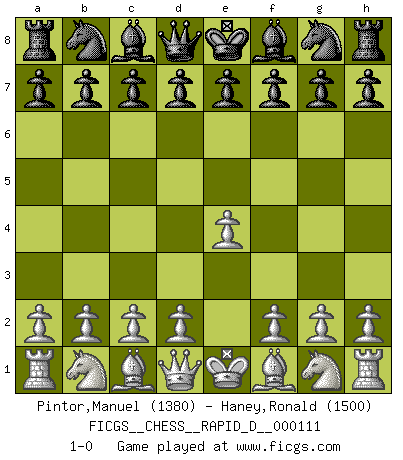 Last move : 1-0 2018 April 11 20:49:57 [Event "FICGS__CHESS__RAPID_D__000111"] [Site "FICGS"] [Date "2018.03.12"] [Round "1"] [White "Pintor,Manuel"] [Black "Haney,Ronald"] [Result "1-0"] [WhiteElo "1380"] [BlackElo "1500"] 1.e4 1-0 This chess game has been lost on time (started : 2018.03.12 15:36:1) King's pawn Opening Player White won this chess game. Follow this game move after move (download)I had a toothache during the first game. In the second game I had a headache. In the third game it was an attack of rheumatism. In the fourth game, I wasn't feeling well. And in the fifth game? Well, must one have to win every game ? (Siegbert Tarrasch) Drei Punkte vor allen anderen ist wie einer, der im weißen Anzug posiert, während der Rest in Müllsäcke gekleidet dasteht. (Viktor Kortschnoi) No es suficiente ser un buen jugador, se debe también de jugar bién. (Siegbert Tarrasch) Il n'y a pas eu de défaite parce que je ne crois pas que cet ordinateur ait jamais existé. IBM a triché en refusant d'imprimer les modes de recherche de la machine. C'est évident, pendant le match, des coups décisifs ont été joués par des êtres humains. Aujourd'hui, les meilleurs spécialistes en informatique ne peuvent toujours pas expliquer comment Deep-Blue a pu jouer contre la logique des ordinateurs. IBM a gagné une guerre de communication, mais ils sont incapables de prouver que l'ordinateur a gagné tout seul. (Garry Kasparov) At work, the authority of a person is inversely proportional to the number of pens that person is carrying. (Dan Rotaru)