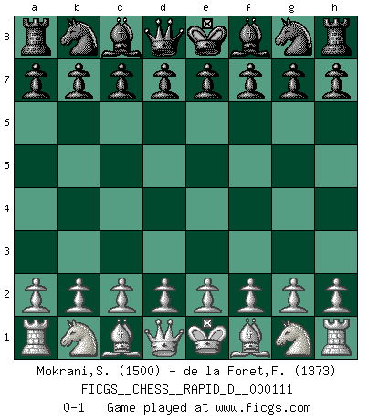 Last move : 0-1 2018 April 11 20:49:57 [Event "FICGS__CHESS__RAPID_D__000111"] [Site "FICGS"] [Date "2018.03.12"] [Round "1"] [White "Mokrani,Sofiane"] [Black "de la Foret,Fred"] [Result "0-1"] [WhiteElo "1500"] [BlackElo "1373"] 0-1 This chess game has been lost on time (started : 2018.03.12 15:36:1) Player Black won this chess game. Follow this game move after move (download)Chess is a part of culture and if a culture is declining then Chess too will decline. (Mikhail Botvinnik) Ihnen, Herr Lasker, habe ich nur drei Worte zu sagen: Schach und matt. (Siegbert Tarrasch) El Ajedrez es tan inspirador que yo no creo que un buen jugador sea capaz de tener un pensamiento malo durante una partida. (Wilhelm Steinitz) Les échecs sont utiles à l'exercice de la faculté de penser et à celle de l'imagination. Car nous devons posséder une méthode élaborée pour atteindre des buts partout où nous devons conduire notre raison. (Leibnitz) Luck never gives; it only lends. (Swedish proverb)