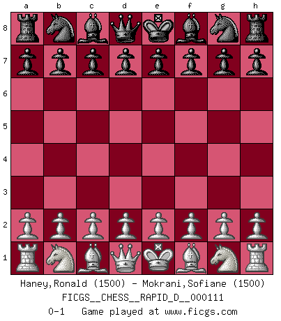 Last move : 0-1 2018 April 11 20:49:57 [Event "FICGS__CHESS__RAPID_D__000111"] [Site "FICGS"] [Date "2018.03.12"] [Round "1"] [White "Haney,Ronald"] [Black "Mokrani,Sofiane"] [Result "0-1"] [WhiteElo "1500"] [BlackElo "1500"] 0-1 This chess game has been lost on time (started : 2018.03.12 15:36:1) Player Black won this chess game. Follow this game move after move (download)The mistakes are there, waiting to be made. (Savielly Tartakower) Wer der Ansicht ist, daß alle Schachspieler verrückt sind, wird durch Studium des Lebens von Emil Josef Diemer nicht auf andere Gedanken kommen. (Hans Ree) El Ajedrez es parte de una cultura y si una cultura esta en decadencia, entonces también el Ajedrez declinará. (Mikhail Botvinnik) J'ai toujours senti une vague pitié pour l'homme qui ne connaît rien aux échecs, tout comme j'en aurais pour un homme ignorant de l'amour. Les Echecs, comme la musique ou comme l'amour, ont le pouvoir de rendre heureux. (Siegbert Tarrasch) Winning isn't everything... but losing is nothing. (Mednis)