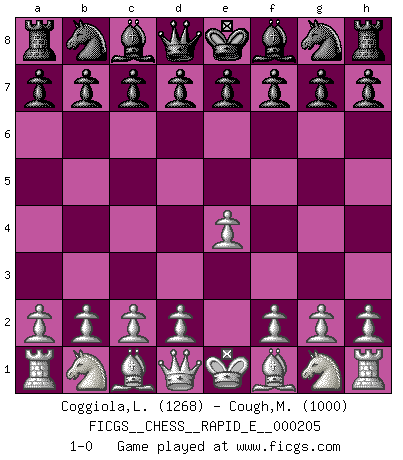 Last move : 1-0 2018 April 12 20:55:8 [Event "FICGS__CHESS__RAPID_E__000205"] [Site "FICGS"] [Date "2018.03.13"] [Round "1"] [White "Coggiola,Leandro Damian"] [Black "Cough,Michael"] [Result "1-0"] [WhiteElo "1268"] [BlackElo "1000"] 1.e4 1-0 This chess game has been lost on time (started : 2018.03.13 14:48:43) King's pawn Opening Player White won this chess game. Follow this game move after move (download)Via the squares on the chessboard, the Indians explain the movement of time and the age, the higher influences which control the world and the ties which link Chess with the human soul. (Al-Masudi) Ich hatte Zahnschmerzen im ersten Spiel. In der zweiten Partie tat mir der Kopf weh. In der dritten war es eine Rheuma-Attacke und während der vierten fühlte ich mich nicht gut. Und in der fünften? Nun, man muss doch nicht jedes Spiel gewinnen, oder? (Savielly Grigorievitsch Tartakower) El hombre es un frívolo, una creatura engañosa y como un jugador de Ajedrez, se preocupa mas por el proceso de obtener su meta que de la meta por sí misma. (Dostoyevsky) Les sacrifices démontrent seulement que quelqu'un a gaffé. (Savielly Tartacover) Perception is reality. (Immanuel Kant)