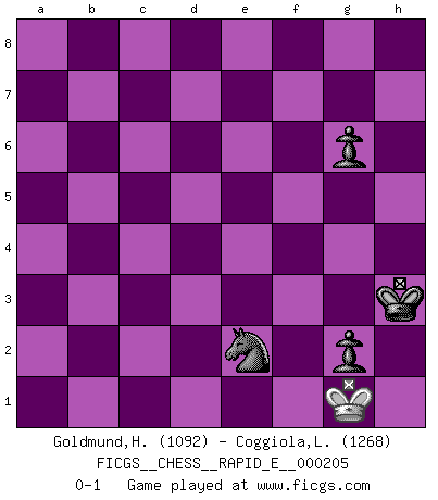 Last move : 0-1 2018 May 8 18:55:56 [Event "FICGS__CHESS__RAPID_E__000205"] [Site "FICGS"] [Date "2018.03.13"] [Round "1"] [White "Goldmund,Heike"] [Black "Coggiola,Leandro Damian"] [Result "0-1"] [WhiteElo "1092"] [BlackElo "1268"] 1.b4 e5 2.Bb2 d6 3.e3 Nf6 4.c4 Be7 5.Nf3 O-O 6.d3 Bg4 7.Be2 Nbd7 8.O-O c6 9.Nbd2 a5 10.b5 cxb5 11.cxb5 Rc8 12.h3 Bh5 13.Ng5 Bg6 14.Ngf3 Nc5 15.d4 e4 16.Nh4 Nd3 17.Bxd3 exd3 18.Nxg6 hxg6 19.Qb3 Rc2 20.Rab1 Qc7 21.Qxd3 Rc8 22.Nb3 d5 23.Rfc1 Ne4 24.Rxc2 Qxc2 25.Qxc2 Rxc2 26.Nxa5 Rxf2 27.Nxb7 Re2 28.a4 Rxe3 29.Rc1 Rb3 30.Rc8+ Kh7 31.Rc2 Rb4 32.Ba3 Rb1+ 33.Rc1 Rxc1+ 34.Bxc1 Nc3 35.a5 Nxb5 36.Nc5 Nxd4 37.Nb7 Bf6 38.Be3 Nc6 39.a6 d4 40.Bf4 g5 41.Bd6 Kg6 42.g4 d3 43.a7 Bd4+ 44.Kf1 Bxa7 45.Nc5 Bxc5 46.Bxc5 f5 47.Be3 f4 48.Bd2 Kf6 49.Bc3+ Ne5 50.Ke1 g6 51.Kd2 Ke6 52.Ba5 f3 53.Ke1 Kd5 54.Bc3 Ke4 55.Kf2 Nc6 56.Ke1 Nd4 57.Kf2 Ne2 58.Bb4 Nf4 59.Kg3 Ke3 60.Be1 d2 61.Bxd2+ Kxd2 62.Kxf3 Nxh3 63.Kg3 Nf4 64.Kf2 Kd3 65.Kf3 Nd5 66.Kf2 Ke4 67.Kg3 Ke3 68.Kg2 Kf4 69.Kh3 Kf3 70.Kh2 Kxg4 71.Kg2 Kh4 72.Kh2 g4 73.Kg2 Nf4+ 74.Kh2 g3+ 75.Kg1 Kh3 76.Kh1 g2+ 77.Kg1 Ne2+ 0-1 Polish (Sokolsky) opening Kingside Castling by player Black (move 5) Kingside Castling by player White (move 8) 10 pieces endgame at move 46 : White KBPP , Black KNPPPP WHITE : King + 1 Bishop 2 Pawns BLACK : King + 1 Knight 4 Pawns 9 pieces endgame at move 61 : White KBPP , Black KNPPP WHITE : King + 1 Bishop 2 Pawns BLACK : King + 1 Knight 3 Pawns 8 pieces endgame at move 61 : White KPP , Black KNPPP WHITE : King + 2 Pawns BLACK : King + 1 Knight 3 Pawns 7 pieces endgame at move 62 : White KPP , Black KNPP WHITE : King + 2 Pawns BLACK : King + 1 Knight 2 Pawns 6 pieces endgame at move 62 : White KP , Black KNPP WHITE : King + 1 Pawn BLACK : King + 1 Knight 2 Pawns 5 pieces endgame at move 70 : White K , Black KNPP WHITE : King + BLACK : King + 1 Knight 2 Pawns Player Black won this chess game. Follow this game move after move (download)I play correspondence chess because it is both art and science while chess is art only. (A player at FICGS) Rauchen ist dem Schachspieler bei seiner Arbeit, also im Wettkampf, untersagt. (Viktor Kortschnoi) No todos los artistas son jugadores de Ajedrez, pero todos los jugadores de Ajedrez son artistas. (Marcel Duchamp) Si rien de grave n'est détecté lors de l'analyse d'une position, on joue alors le coup. Seconde règle de Blumenfeld. Is not life a hundred times too short to bore ourselves ? (Friedrich Nietzsche)