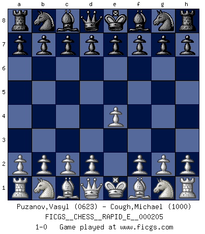 Last move : 1-0 2018 May 11 23:12:11 [Event "FICGS__CHESS__RAPID_E__000205"] [Site "FICGS"] [Date "2018.03.13"] [Round "1"] [White "Puzanov,Vasyl"] [Black "Cough,Michael"] [Result "1-0"] [WhiteElo "0623"] [BlackElo "1000"] 1.e4 1-0 This chess game has been lost on time (started : 2018.03.13 14:48:43) King's pawn Opening Player White won this chess game. Follow this game move after move (download)Chess is a terrific way for kids to build self image and self esteem. (Saudin Robovic) Spielt Blackmar-Diemer-Gambit, und das Matt kommt von selbst! (Emil Joseph Diemer) El jugador blanco perdió porque fallo en recordar la coreccta continuación y tuvo que pensar por sí mismo las movidas. (Siegbert Tarrasch) Demandez au pauvre Cg1 ce qu'il en pense. Eduard Gufeld à propos de la variante Saemisch de l'Est-Indienne. The smarter you play, the luckier you'll be. (Mark Pilarski)