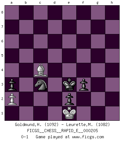 Last move : 0-1 2018 April 22 19:40:48 [Event "FICGS__CHESS__RAPID_E__000205"] [Site "FICGS"] [Date "2018.03.13"] [Round "1"] [White "Goldmund,Heike"] [Black "Leurette,Marc-Antoine"] [Result "0-1"] [WhiteElo "1092"] [BlackElo "1082"] 1.e4 e5 2.Nf3 Nc6 3.Bc4 Nf6 4.d3 d6 5.Nc3 Be7 6.Nd5 O-O 7.O-O Bg4 8.Nxe7+ Qxe7 9.h3 Bxf3 10.Qxf3 Nd4 11.Qg3 Ne2+ 12.Kh2 Nxg3 13.Kxg3 Nh5+ 14.Kh2 a6 15.g3 c6 16.Be3 b5 17.Bb3 Qf6 18.c3 g6 19.f4 exf4 20.gxf4 Qe7 21.Rg1 Kg7 22.f5 Qe5+ 23.Kh1 Ng3+ 24.Kg2 gxf5 25.Bd4 f4 26.Bxe5+ dxe5 27.Kf3 a5 28.d4 f6 29.Rad1 Rad8 30.Be6 h5 31.h4 a4 32.dxe5 fxe5 33.Rd7+ Rxd7 34.Bxd7 Rf6 35.Rg2 Rd6 36.Be8 Re6 37.Bxh5 c5 38.Bg4 Rd6 39.Bf5 Kh6 40.Bg4 Rd3+ 41.Kf2 Rd2+ 42.Kf3 Rxg2 43.Kxg2 b4 44.cxb4 cxb4 45.Bd1 a3 46.bxa3 bxa3 47.Bg4 Nxe4 48.Kf3 Nf6 49.Be6 Kh5 50.Bc8 Kxh4 51.Bb7 Kg5 52.Kf2 e4 53.Ba6 e3+ 54.Kf3 Nd5 55.Bc4 Nc3 56.Kg2 e2 57.Kf2 Kg4 58.Ke1 f3 59.Kf2 Kf4 60.Ke1 Ke3 0-1 Two knights defense (Modern Bishop's Opening) Kingside Castling by player Black (move 6) Kingside Castling by player White (move 7) 10 pieces endgame at move 46 : White KBPPP , Black KNPPP WHITE : King + 1 Bishop 3 Pawns BLACK : King + 1 Knight 3 Pawns 9 pieces endgame at move 47 : White KBPP , Black KNPPP WHITE : King + 1 Bishop 2 Pawns BLACK : King + 1 Knight 3 Pawns 8 pieces endgame at move 50 : White KBP , Black KNPPP WHITE : King + 1 Bishop 1 Pawn BLACK : King + 1 Knight 3 Pawns Player Black won this chess game. Follow this game move after move (download)Those who say they understand Chess, understand nothing. (Robert Hubner) Besser ein falscher Plan, logisch durchgeführt, als gar kein Plan. (Viktor Kortschnoi) El arma más poderosa en el Ajedrez, es tener la próxima movida. (David Bronstein) Les réformistes prétendent que les progrès de la théorie conduiront à la disparition des échecs, et qu'il faut, pour leur rendre vie, en remanier les règles. En réalité, qu'exprime cette affirmation? Le mépris de l'intuition, de l'imagination et de tous les autres éléments qui font des échecs un art. (Alexander Alekhine) A good book on your shelf is a friend that turns its back on you and remains a friend. (Author unknown)