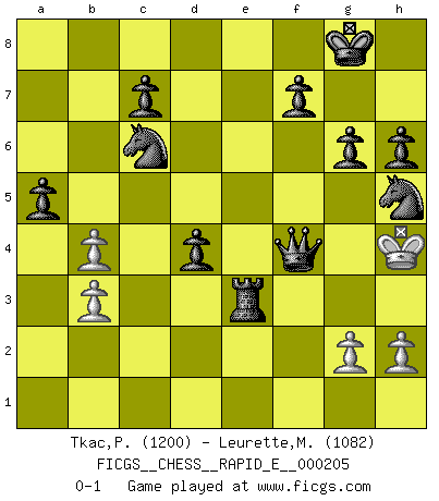 Last move : 0-1 2018 March 16 13:26:42 [Event "FICGS__CHESS__RAPID_E__000205"] [Site "FICGS"] [Date "2018.03.13"] [Round "1"] [White "Tkac,Patrik"] [Black "Leurette,Marc-Antoine"] [Result "0-1"] [WhiteElo "1200"] [BlackElo "1082"] 1.Nf3 d5 2.d4 Nc6 3.Bf4 Nf6 4.Nc3 e6 5.Nb5 Bd6 6.e3 Bxf4 7.exf4 a6 8.Nc3 O-O 9.Bd3 b5 10.Ng5 h6 11.O-O b4 12.Na4 a5 13.Nh7 Nxh7 14.Qg4 Nf6 15.Rae1 Nxg4 16.Nc5 Qf6 17.f3 Qxd4+ 18.Kh1 Nf6 19.f5 Qxc5 20.fxe6 Bxe6 21.Re2 d4 22.Rfe1 Bc4 23.b3 Bxd3 24.cxd3 Rae8 25.Rxe8 Rxe8 26.Kg1 Rxe1+ 27.Kf2 Re3 28.a3 Qc2+ 29.Kg3 Qxd3 30.axb4 Nh5+ 31.Kg4 g6 32.f4 Qf5+ 33.Kh4 Qxf4+ 0-1 Reti Opening Kingside Castling by player Black (move 8) Kingside Castling by player White (move 11) Player Black won this chess game. Follow this game move after move (download)There is only one thing Fischer does in Chess without pleasure: to lose ! (Boris Spassky) Jeder weiß, dass Gasprom Putins persönliches Machtinstrument ist. Die Firma wird vom Kreml aus geleitet und wird schon deshalb nie transparent sein. (Garry Kasparov) Mi estilo es algo parecido entre un poco de Tal y Petrosian. (Reshevsky) Ne tendez aucun piège pour le plaisir ! Ne jouez rien dans l'espoir que l'adversaire réagisse de façon stupide ! Prenez toujours pour acquis que l'adversaire va trouver le meilleur coup ! Ne jouez jamais de coup dans l'espoir que l'adversaire ne voie pas la menace ! Chacun de vos coups doit améliorer la position d'une façon ou d'une autre. However beautiful the strategy, you should occasionally look at the results. (Winston Churchill)