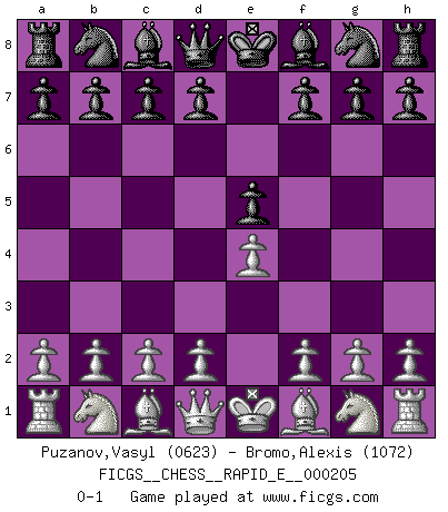 Last move : 0-1 2018 April 14 8:57:31 [Event "FICGS__CHESS__RAPID_E__000205"] [Site "FICGS"] [Date "2018.03.13"] [Round "1"] [White "Puzanov,Vasyl"] [Black "Bromo,Alexis"] [Result "0-1"] [WhiteElo "0623"] [BlackElo "1072"] 1.e4 e5 0-1 This chess game has been lost on time (started : 2018.03.13 14:48:43) King's pawn game Player Black won this chess game. Follow this game move after move (download)Many have become Chess Masters, no one has become the Master of Chess. (Siegbert Tarrasch) Stelle das Brett so, daß die Sonne in die Augen deines Gegners scheint. (Ruy López) El estómago es una parte esencial del maestro de Ajedrez. (Bent Larsen) Le temps de noter son nom sur la feuille de partie, j'étais déjà en zeitnot ! D'un modeste amateur apparié lors de la première ronde d'un open contre le grand-maître Azmaïparashvili. I don't diet. I just don't eat as much as I'd like to. (Linda Evangelista, supermodel)