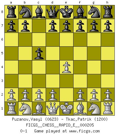Last move : 0-1 2018 April 15 9:1:29 [Event "FICGS__CHESS__RAPID_E__000205"] [Site "FICGS"] [Date "2018.03.13"] [Round "1"] [White "Puzanov,Vasyl"] [Black "Tkac,Patrik"] [Result "0-1"] [WhiteElo "0623"] [BlackElo "1200"] 1.e4 c5 0-1 This chess game has been lost on time (started : 2018.03.13 14:48:43) Sicilian defense Player Black won this chess game. Follow this game move after move (download)Life is a kind of Chess, with struggle, competition, good and ill events. (Benjamin Franklin) Je älter ich werde, um so mehr schätze ich die Bauern. (Paul Keres) Cuando la partida de Ajedrez termina, el Peón y el Rey regresan a la misma caja. (Irish saying) Les Echecs, c'est l'art de la guerre sans les charniers, c'est la résurrection des morts tombés au champ d'honneur, l'espoir perpétuel, la suprématie de l'intelligence sur la force, la culture de l'esprit. (F. Szpiner) Fame, I have already. Now I need the money. (an elderly Steinitz)