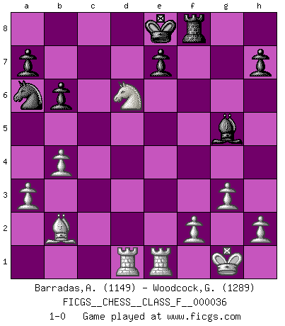 Last move : 1-0 2007 May 21 15:0:34 [Event "FICGS__CHESS__CLASS_F__000036"] [Site "FICGS"] [Date "2007.04.28"] [Round "1"] [White "Barradas,Anderson"] [Black "Woodcock,Graham"] [Result "1-0"] [WhiteElo "1149"] [BlackElo "1289"] 1.d4 d5 2.c4 b6 3.Nf3 Bb7 4.Nc3 g6 5.cxd5 Bxd5 6.e4 Be6 7.d5 Bg4 8.Bb5+ Bd7 9.Ne5 Bxb5 10.Nxb5 Nf6 11.Qc2 Na6 12.O-O Bg7 13.Qc6+ Nd7 14.Nxd7 Qxd7 15.Qxa8+ Qd8 16.Qxd8+ Kxd8 17.Rb1 f5 18.exf5 gxf5 19.a3 Kd7 20.b4 Ra8 21.Bb2 Bh6 22.g3 c6 23.dxc6+ Kxc6 24.Nd4+ Kd7 25.Nxf5 Bg5 26.Rfe1 Rf8 27.Rbd1+ Ke8 28.Nd6+ 1-0 Queen's Gambit Kingside Castling by player White (move 12) Player White won this chess game. Follow this game move after move (download)Best by test: 1. e4 (Bobby Fischer) Im Hotelzimmer gab es nur zwei Schaben. (Über die Turnierbedingungen) (Peter Swidler) La señal de un Gran Maestro es su habilidad de ganar una partida rápidamente y sin dolor. (Irving Chernev) RxDa4 pat (...) Don't be discouraged. It's often the last key in the bunch that opens the lock. (Author unknown)