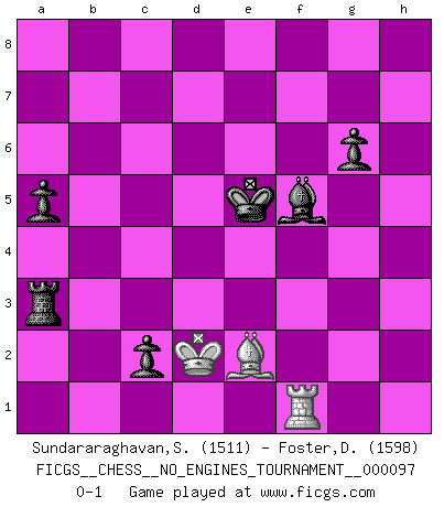 Last move : 0-1 2018 September 23 15:12:18 [Event "FICGS__CHESS__NO_ENGINES_TOURNAMENT__000097"] [Site "FICGS"] [Date "2018.03.15"] [Round "1"] [White "Sundararaghavan,Shailesh"] [Black "Foster,Duncan"] [Result "0-1"] [WhiteElo "1511"] [BlackElo "1598"] 1.e4 e5 2.Nf3 Nc6 3.Bc4 Nf6 4.d4 exd4 5.Nxd4 Nxe4 6.O-O d5 7.Bb5 Bd7 8.Nxc6 bxc6 9.Ba4 Bc5 10.Be3 Bxe3 11.fxe3 O-O 12.Nd2 Re8 13.Nxe4 Rxe4 14.Bb3 Qg5 15.Qf3 Qxe3+ 16.Qxe3 Rxe3 17.Rae1 Rxe1 18.Rxe1 Be6 19.Ba4 c5 20.c3 Rb8 21.Re2 Kf8 22.Kf2 Ke7 23.Bc6 Kd6 24.Ba4 d4 25.Rd2 Ke5 26.cxd4+ cxd4 27.a3 c5 28.Bc6 Rc8 29.Bf3 c4 30.Re2+ Kf6 31.h4 Bf5 32.g4 Be6 33.g5+ Ke7 34.Re4 c3 35.bxc3 dxc3 36.Re1 c2 37.Rc1 Bf5 38.Ke3 Rc3+ 39.Ke2 Rxa3 40.h5 f6 41.gxf6+ Kxf6 42.Rf1 Kg5 43.Kd2 a5 44.Rg1+ Kf4 45.Be2 g6 46.hxg6 hxg6 47.Rf1+ Ke5 0-1 Two knights defense Kingside Castling by player White (move 6) Kingside Castling by player Black (move 11) 10 pieces endgame at move 46 : White KRBP , Black KRBPPP WHITE : King + 1 Rook 1 Bishop 1 Pawn BLACK : King + 1 Rook 1 Bishop 3 Pawns 9 pieces endgame at move 46 : White KRB , Black KRBPPP WHITE : King + 1 Rook 1 Bishop BLACK : King + 1 Rook 1 Bishop 3 Pawns Player Black won this chess game. Follow this game move after move (download)No Chess Grandmaster is normal; they only differ in the extent of their madness. (Viktor Korchnoi) Dieses schreckliche Gefühl, dass ich gegen eine Maschine spielte, die niemals Fehler macht, zerschmetterte meinen Widerstand. (Mark Taimanov) No solamente yo pronostico su triunfo sobre Botvinnik, sino que me adelanto y digo que probablemente Fischer es el jugador de Ajedrez mas grande que haya existido. (John Collins) Le jeu d'échecs fait naître et fortifie en nous plusieurs qualités précieuses dans le cours de l'existence, telles que la prévoyance, la circonspection, la prudence, et la persévérance. (Benjamin Franklin - 1783, la morale des échecs) Over-the-board chess is the favorite of mortals, correspondence chess is the favorite of the gods. (Eduard Dyckhoff)