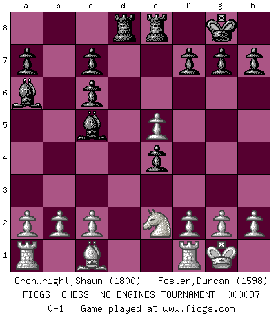 Last move : 0-1 2018 April 3 18:34:48 [Event "FICGS__CHESS__NO_ENGINES_TOURNAMENT__000097"] [Site "FICGS"] [Date "2018.03.15"] [Round "1"] [White "Cronwright,Shaun"] [Black "Foster,Duncan"] [Result "0-1"] [WhiteElo "1800"] [BlackElo "1598"] 1.e4 e5 2.Nf3 Nc6 3.Bc4 Nf6 4.d4 exd4 5.e5 d5 6.Bb5 Ne4 7.Nxd4 Bc5 8.Bxc6+ bxc6 9.O-O Ba6 10.Ne2 O-O 11.Nd2 Re8 12.Nxe4 dxe4 13.Qxd8 Raxd8 0-1 Two knights defense Kingside Castling by player White (move 9) Kingside Castling by player Black (move 10) Player Black won this chess game. Follow this game move after move (download)One of these modest little moves may be more embarrassing to your opponent than the biggest threat. (Siegbert Tarrasch) Alle offensichtlichen Züge sehen nach dem Spiel in der Analyse verdächtig aus. (Viktor Kortschnoi) Estaba muy claro de que el punto vulnerable del Gran Maestro Americano (Bobby Fischer) radicaba en las posiciones de doble filo, colgantes, irracionales, donde el siempre falló en encontrar un triunfo aún en una posición de clara victoria. (Efim Geller) A ce moment-là, je menaçais de comprendre la position ! (Clément L'Heureux) In fact if nothing is done against this teddy bear, hereby I announce that I would quit chess, rapid chess, blitz chess, postal chess, email chess, server chess and correspondence chess I will then switch to a table game where teddy bears aren't going to be seen for a while, like Poker, or Roulette, all 18+ games. (Elmer Valderrama)