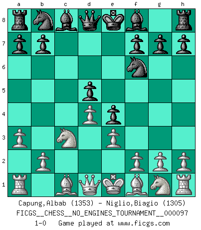 Last move : 1-0 2018 March 31 17:55:56 [Event "FICGS__CHESS__NO_ENGINES_TOURNAMENT__000097"] [Site "FICGS"] [Date "2018.03.15"] [Round "1"] [White "Capung,Albab"] [Black "Niglio,Biagio"] [Result "1-0"] [WhiteElo "1353"] [BlackElo "1305"] 1.e3 e5 2.c3 d5 3.d4 e4 4.c4 c6 5.cxd5 cxd5 6.a3 Nf6 7.Nc3 1-0 Van't Kruijs Opening Player White won this chess game. Follow this game move after move (download)The tactician must know what to do whenever something needs doing; the strategist must know what to do when nothing needs doing. (Savielly Tartakover) Schach ist wie eine schöne Frau, zu der wir ständig zurückkehren, gleichviel, wie oft sie uns zurückweist. (Anonymous) Bobby solo arroja las piezas y solas caen en las casillas correctas. (Miguel Najdorf ) Les erreurs sont comme les malheurs, elles n'arrivent jamais seules. (Siegbert Tarrasch) Computer Science is no more about computers than astronomy is about telescopes. (Edsger W. Dijkstra)