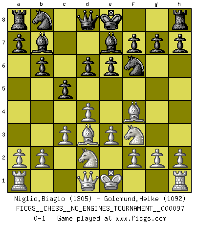 Last move : 0-1 2018 March 31 17:56:7 [Event "FICGS__CHESS__NO_ENGINES_TOURNAMENT__000097"] [Site "FICGS"] [Date "2018.03.15"] [Round "1"] [White "Niglio,Biagio"] [Black "Goldmund,Heike"] [Result "0-1"] [WhiteElo "1305"] [BlackElo "1092"] 1.d4 Nf6 2.Nf3 e6 3.Bf4 b6 4.e3 Bb7 5.Nbd2 c5 6.c3 d6 7.Bd3 Be7 0-1 Queen's pawn game Player Black won this chess game. Follow this game move after move (download)If cunning alone were needed to excel, women would be the best Chess players. (Albin) Fischer: 'Remis!?' Uhlmann: 'Aber es muss doch dreimal Zugwiederholung sein!' Fischer: 'Sie nehmen das Remis an, wie ich es sage, sonst spiele ich weiter und werde Sie dann schlagen!' (Robert James Fischer) Aunque la mayoría de la gente disfruta observar las partidas de los grandes Maestros de ataque, algunos de los jugadores mas notables en la historia han sido los jugadores silenciosos posicionales. Lentamente ellos te aplastan despojandote de tu espacio, congestionando tus piezas y dejandote virtualmente sin nada que hacer. (Yasser Seirawan) Les réformistes prétendent que les progrès de la théorie conduiront à la disparition des échecs, et qu'il faut, pour leur rendre vie, en remanier les règles. En réalité, qu'exprime cette affirmation? Le mépris de l'intuition, de l'imagination et de tous les autres éléments qui font des échecs un art. (Alexander Alekhine) Beep ! (R2D2 in Star Wars ep.3)