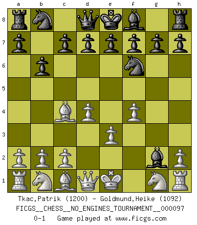 Last move : 0-1 2018 March 19 14:55:32 [Event "FICGS__CHESS__NO_ENGINES_TOURNAMENT__000097"] [Site "FICGS"] [Date "2018.03.15"] [Round "1"] [White "Tkac,Patrik"] [Black "Goldmund,Heike"] [Result "0-1"] [WhiteElo "1200"] [BlackElo "1092"] 1.d4 Nf6 2.e3 b6 3.Bc4 Bb7 4.f4 Bxg2 0-1 Queen's pawn game Player Black won this chess game. Follow this game move after move (download)Chess is in its essence a game, in its form an art, and in its execution a science. (Baron Tassilo) Die westlichen Werte sind eine Sprache, welche die Putin-Administration nicht versteht. (Garry Kasparov) Sin errores no puede haber brillantez. (Emanuel Lasker) C'est la seule position que je connaisse où les deux camps sont mals. Propos prêtés à V. Anand. SEO proverb : Make your website optimized for human beings, not for search engines.
