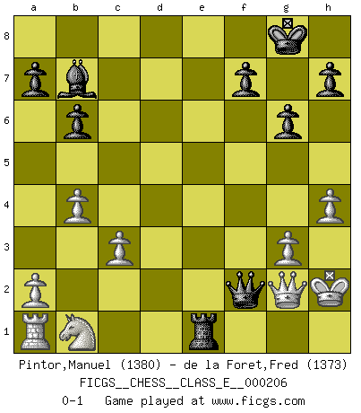 Last move : 0-1 2018 April 10 19:46:4 [Event "FICGS__CHESS__CLASS_E__000206"] [Site "FICGS"] [Date "2018.03.16"] [Round "1"] [White "Pintor,Manuel"] [Black "de la Foret,Fred"] [Result "0-1"] [WhiteElo "1380"] [BlackElo "1373"] 1.e4 c5 2.f4 Nc6 3.Nf3 g6 4.Bc4 Bg7 5.O-O e6 6.c3 d5 7.exd5 exd5 8.Bb5 Nge7 9.Ne5 Qb6 10.Bxc6+ Nxc6 11.d4 O-O 12.Nxc6 Qxc6 13.Be3 Re8 14.Bf2 b6 15.h4 Ba6 16.Re1 Rxe1+ 17.Qxe1 Re8 18.Qd2 Re2 19.Qd1 cxd4 20.Bxd4 Qb5 21.b4 Bxd4+ 22.Qxd4 Re1+ 23.Kh2 Qf1 24.Qxd5 Qxf4+ 25.g3 Qf2+ 26.Qg2 Bb7 0-1 Sicilian : Grand Prix attack Kingside Castling by player White (move 5) Kingside Castling by player Black (move 11) Player Black won this chess game. Follow this game move after move (download)I have added these principles to the law: get the Knights into action before both Bishops are developed. (Emanuel Lasker) Ich liebe den Moment, wenn ich das Ego meines Gegenüber breche. (Robert James Fischer) Si el ingenio solamente fuese necesario para lucirse, las mujeres serían las mejores jugadoras de Ajedrez del mundo. (Albin) Même si vous avez un bon coup à faire, regardez toujours s'il n'y en a pas un qui lui soit préférable. (Pedro Damiano) CHESS, n. f. [echecs, Fr.] A nice and abstruse game, in which two sets of puppets are moved in opposition to each other. (Dr Samuel Johnson, A Dictionary Of The English Language, 1755)