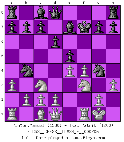 Last move : 1-0 2018 March 19 14:55:40 [Event "FICGS__CHESS__CLASS_E__000206"] [Site "FICGS"] [Date "2018.03.16"] [Round "1"] [White "Pintor,Manuel"] [Black "Tkac,Patrik"] [Result "1-0"] [WhiteElo "1380"] [BlackElo "1200"] 1.e4 e5 2.f4 d6 3.Nf3 Nc6 4.Bc4 Nf6 5.Nc3 Be7 6.Bxf7+ Kxf7 7.O-O Ng4 8.h3 Nb4 9.a3 1-0 King's gambit Kingside Castling by player White (move 7) Player White won this chess game. Follow this game move after move (download)Fischer is an American Chess tragedy on par with Morphy and Pillsbury. (Mig Greengard) Fischer machte Schach einfach zu einer aufregenden Sache, wann immer er sich ans Brett setzte. (Raymond Keene) Una de estas pequeñas movidas modestas pudieran ser mas molestas a tu oponente que la amenaza mas grande. (Siegbert Tarrasch) Il a essayé de se convaincre qu'il pourrait empêcher toutes les erreurs et ne jamais perdre. L'horreur ! Gary Kasparov au sujet de Robert Fischer. The problem with manipulation is that people can turn on you. (Horatio Caine, C.S.I. Miami)