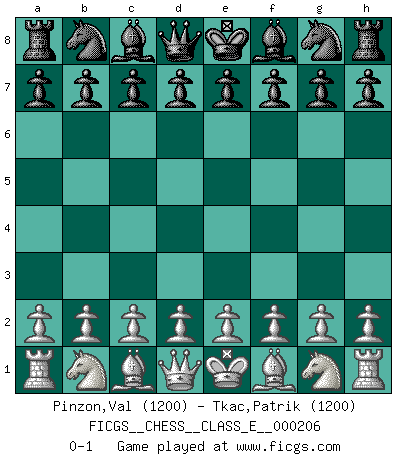 Last move : 0-1 2018 April 25 21:57:53 [Event "FICGS__CHESS__CLASS_E__000206"] [Site "FICGS"] [Date "2018.03.16"] [Round "1"] [White "Pinzon,Val"] [Black "Tkac,Patrik"] [Result "0-1"] [WhiteElo "1200"] [BlackElo "1200"] 0-1 This chess game has been lost on time (started : 2018.03.16 11:5:15) Player Black won this chess game. Follow this game move after move (download)A bad plan is better than none at all. (Frank Marshall) Schach ist wie eine schöne Frau, zu der wir ständig zurückkehren, gleichviel, wie oft sie uns zurückweist. (Anonymous) Bobby solo arroja las piezas y solas caen en las casillas correctas. (Miguel Najdorf ) Vouloir jouer aux échecs contre soi-même est aussi paradoxal que vouloir marcher sur son ombre. (Stefan Zweig) The only difference between a tax man and a taxidermist is that the taxidermist leaves the skin. (Mark Twain)