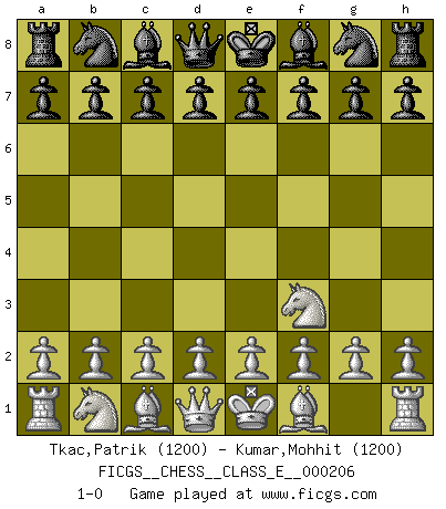 Last move : 1-0 2018 April 25 21:57:53 [Event "FICGS__CHESS__CLASS_E__000206"] [Site "FICGS"] [Date "2018.03.16"] [Round "1"] [White "Tkac,Patrik"] [Black "Kumar,Mohhit"] [Result "1-0"] [WhiteElo "1200"] [BlackElo "1200"] 1.Nf3 1-0 This chess game has been lost on time (started : 2018.03.16 11:5:15) Reti Opening Player White won this chess game. Follow this game move after move (download)The laws of Chess do not permit a free choice: you have to move whether you like it or not. (Emanuel Lasker) Jede Eröffnung ist gut genug um gespielt zu werden, wenn nur ihr Ruf schlecht genug ist. (Savielly Grigorievitsch Tartakower) El Ajedrez es sobre todo, ¡una pelea!. (Emanuel Lasker) Les Echecs ne sont pas pour les âmes timides. Ils requièrent un homme entier, qui ne s'arrête pas aveuglément à ce qui a été déjà établi, mais qui tente individuellement de sonder les profondeurs du jeu. (W. Steinitz) You cannot beat a roulette table unless you steal money from it. (Albert Einstein)