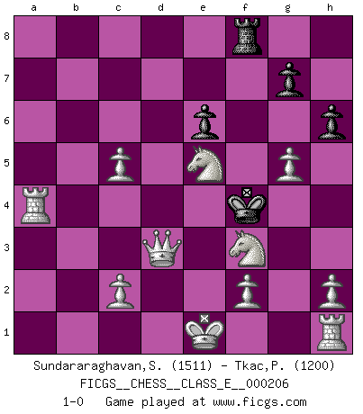 Last move : 1-0 2018 May 11 11:20:54 [Event "FICGS__CHESS__CLASS_E__000206"] [Site "FICGS"] [Date "2018.03.16"] [Round "1"] [White "Sundararaghavan,Shailesh"] [Black "Tkac,Patrik"] [Result "1-0"] [WhiteElo "1511"] [BlackElo "1200"] 1.e4 c6 2.d4 d5 3.Nc3 Nf6 4.e5 Nfd7 5.Nf3 Na6 6.Be3 b5 7.a3 b4 8.axb4 c5 9.Bxa6 Bxa6 10.Rxa6 Nb8 11.Ra1 Qb6 12.bxc5 Qxb2 13.Nxd5 e6 14.Nc7+ Kd8 15.Nxa8 Qb4+ 16.Bd2 Qc4 17.Bg5+ Be7 18.Bxe7+ Kxe7 19.Rxa7+ Nd7 20.Nb6 Rd8 21.Nxc4 f6 22.exf6+ Kxf6 23.g4 Nxc5 24.g5+ Kf5 25.Nce5 Rf8 26.dxc5 h6 27.Qd3+ Kf4 28.Ra4+ 1-0 Caro-Kann defense Player White won this chess game. Follow this game move after move (download)I know people who have all the will in the world, but still can't play good Chess. (Bobby Fischer) Meine Liebe ist Schach, Schach, Schach. Ich muss jeden Tag Schach spielen, deshalb fühle ich mich so stark. (Miguel Najdorf) Cuando veas una buena jugada, trata de encontrar otra mejor. (Emanuel Lasker) Vous savez, camarade Pachman, je n'éprouve pas de plaisir à être ministre, je jouerais plutôt aux échecs comme vous, ou alors ferais une révolution au Venezuela. (Che Guevara à Ludek Pachman, 'Checkmate in Prague', 1975) Everybody lies. (Gregory House, House M.D.)