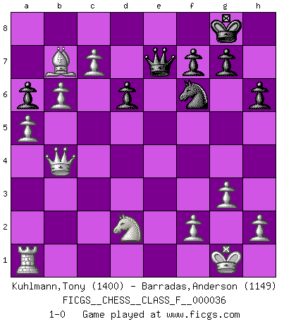 Last move : 1-0 2007 May 16 16:38:12 [Event "FICGS__CHESS__CLASS_F__000036"] [Site "FICGS"] [Date "2007.04.28"] [Round "1"] [White "Kuhlmann,Tony"] [Black "Barradas,Anderson"] [Result "1-0"] [WhiteElo "1400"] [BlackElo "1149"] 1.d4 Nf6 2.c4 e6 3.Nf3 Bb4+ 4.Bd2 Bxd2+ 5.Nbxd2 O-O 6.g3 b6 7.Bg2 Bb7 8.O-O d6 9.Qc2 h6 10.e4 Nc6 11.Rfe1 Nb4 12.Qc3 c5 13.a3 Nc6 14.d5 exd5 15.exd5 Na5 16.b4 cxb4 17.axb4 Re8 18.Rxe8+ Qxe8 19.bxa5 b5 20.Qb4 a6 21.Nd4 Qd7 22.Nc6 Bxc6 23.dxc6 Qc7 24.cxb5 Rb8 25.b6 Qe7 26.c7 Rb7 27.Bxb7 1-0 Bogo-Indian defense Kingside Castling by player Black (move 5) Kingside Castling by player White (move 8) Player White won this chess game. Follow this game move after move (download)Nonsense was the last thing Fischer was interested in, as far as Chess was concerned. (Elie Agur) Alles was am Schachbrett zählt sind gute Züge. (Robert James Fischer) Aquel que teme a un Peón de Reina aislado, debería de retirarse del Ajedrez. (Siegbert Tarrasch) Vouloir jouer aux échecs contre soi-même est aussi paradoxal que vouloir marcher sur son ombre. (Stefan Zweig) It's only after you lost everything, Tyler says, that you're free to do anything. (Chuck Palahniuk, Fight Club)