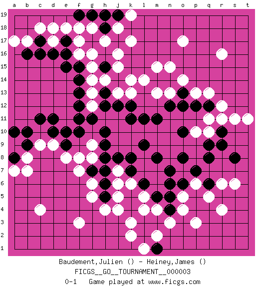 Last move : 0-1 2006 September 8 20:10:13 [Event "FICGS__GO__TOURNAMENT__000003"] [Site "FICGS"] [Date "2006.06.03"] [Round "1"] [Black "Baudement,Julien"] [White "Heiney,James"] [Result "0-1"] 1.d16 c4 2.n7 p3 3.q8 r4 4.l9 r16 5.k11 o17 6.h12 f3 7.f10 d9 8.d11 f17 9.s8 q13 10.b10 b8 11.g11 m4 12.e10 f8 13.o8 j5 14.m8 j16 15.c11 d17 16.c17 d18 17.c16 c18 18.e9 e8 19.d10 c9 20.b9 r11 21.a8 b7 22.a10 a7 23.e15 f16 24.e16 g14 25.f15 g15 26.e17 e18 27.f14 m15 28.h13 g13 29.f13 g12 30.f12 g9 31.j12 k13 32.k12 j15 33.m11 n13 34.l11 r6 35.l6 l5 36.h7 g6 37.j14 k14 38.h15 g16 39.h9 g8 40.h8 h14 41.f11 j13 42.p12 p13 43.o12 q10 44.o13 o14 45.n12 m13 46.h10 p6 47.o6 o5 48.n5 o4 49.n4 n3 50.n6 k6 51.k7 j7 52.j8 j6 53.g7 f7 54.h6 g5 55.h5 h4 56.k8 j4 57.m5 l4 58.q12 r12 59.r9 b17 60.b16 a17 61.j17 h17 62.h18 g18 63.g19 j18 64.h19 k17 65.j19 k19 66.f19 f18 67.r10 q11 68.q9 s11 69.p7 p10 70.n14 n15 71.pass t11 72.m14 l14 73.o10 s6 74.l3 k3 75.l2 k2 76.m3 l1 77.m1 m2 78.q6 q5 0-1 Here are the names of the openings (joseki) played in the four corners : Corner q4 : n7 p3 This joseki is unknown. A weak or weird move has probably been played in this corner. Player White won this Go (weiqi, baduk) game. Follow this game move after move (download)One point in the center is worth ten in the corner. (Anonymous) Crush them ! Make them suffer ! (General Grievous in Star Wars ep.3)
