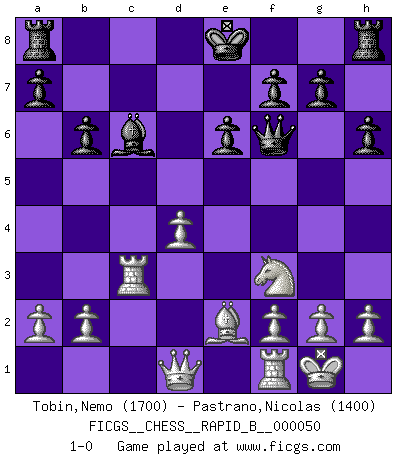 Last move : 1-0 2007 July 20 17:52:55 [Event "FICGS__CHESS__RAPID_B__000050"] [Site "FICGS"] [Date "2007.04.30"] [Round "1"] [White "Tobin,Nemo"] [Black "Pastrano,Nicolas"] [Result "1-0"] [WhiteElo "1700"] [BlackElo "1400"] 1.d4 d5 2.c4 e6 3.Nf3 Nf6 4.Bg5 h6 5.Bxf6 Qxf6 6.e3 c5 7.Nc3 cxd4 8.exd4 Bb4 9.Rc1 Nc6 10.Be2 b6 11.O-O Bb7 12.cxd5 Bxc3 13.dxc6 Bxc6 14.Rxc3 1-0 This chess game has been lost on time (started : 2007.04.30 18:29:53) QGD : Capablanca-Duras variation Kingside Castling by player White (move 11) Player White won this chess game. Follow this game move after move (download)You sit at the board and suddenly your heart leaps. Your hand trembles to pick up the piece and move it. But what Chess teaches you is that you must sit there calmly and think about whether it's really a good idea and whether there are other better ideas. (Stanley Kubrick) Schach ist ein schwarz-weisser Dschungel. (Garry Kasparov) Del Ajedrez se ha dicho que la vida no es lo suficientemente larga para él, pero eso es culpa de la vida, no del Ajedrez. (William Ewart Napier) Ce n'est pas pour s'amuser qu'il joue aux échecs : il célèbre un culte. (Vladimir Nabokov) You can only get smarter by playing a smarter opponent. (Revolver, movie)
