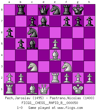 Last move : 1-0 2007 July 29 7:17:55 [Event "FICGS__CHESS__RAPID_B__000050"] [Site "FICGS"] [Date "2007.04.30"] [Round "1"] [White "Pech,Jaroslav"] [Black "Pastrano,Nicolas"] [Result "1-0"] [WhiteElo "1495"] [BlackElo "1400"] 1.e4 e5 2.Nf3 Nc6 3.Bb5 a6 4.Ba4 Nf6 5.O-O d6 6.Re1 Bd7 7.c3 b5 8.Bc2 Be7 9.d4 exd4 10.cxd4 O-O 11.e5 dxe5 12.dxe5 Ne8 13.Be4 Rb8 14.Re2 Bc5 15.Nc3 1-0 This chess game has been lost on time (started : 2007.04.30 18:29:53) Ruy Lopez : Steinitz defense deferred (Russian defense) Kingside Castling by player White (move 5) Kingside Castling by player Black (move 10) Player White won this chess game. Follow this game move after move (download)The isolated Pawn casts gloom over the entire chessboard. (Aaron Nimzovich) Ich hatte Angst gegen einen russischen Großmeister zu verlieren, und er befürchtete gegen einen kleinen Jungen zu verlieren. (über ein Remis gegen Juri Awerbach). (Robert James Fischer) Después de una mala apertura, hay una esperanza en el juego medio. Pero una vez que estas en finales, el momento de la verdad ha llegado. (Edmar Mednis) Des combinaisons [dans le jeu d'échecs] pareilles à des mélodies. Je crois entendre pour ainsi dire la musique des coups... (Vladimir Nabokov) Always be a first-rate version of yourself, instead of a second-rate version of somebody else. (Judy Garland)