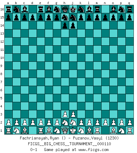 Last move : 0-1 2018 April 17 21:9:3 [Event "FICGS__BIG_CHESS__TOURNAMENT__000110"] [Site "FICGS"] [Date "2018.03.18"] [Round "1"] [White "Fachriansyah,Ryan"] [Black "Puzanov,Vasyl"] [Result "0-1"] [WhiteElo ""] [BlackElo "1230"] 0-1 This big chess game has been lost on time (started : 2018.03.18 16:28:38) Follow this game move after move (download)Chess is really ninety nine percent calculation. (Soltis) Gott hat gewollt, dass ich Champion werde. (Surab Azmajparaschvili) Aquellos que dicen entender al Ajedrez, no entienden nada. (Robert Hubner) La solitude du joueur d'Echecs à l'approche du mat est semblable à celle du condamné. (Francis Szpiner) Experiences are the keys to life. (Daniel Parmet)