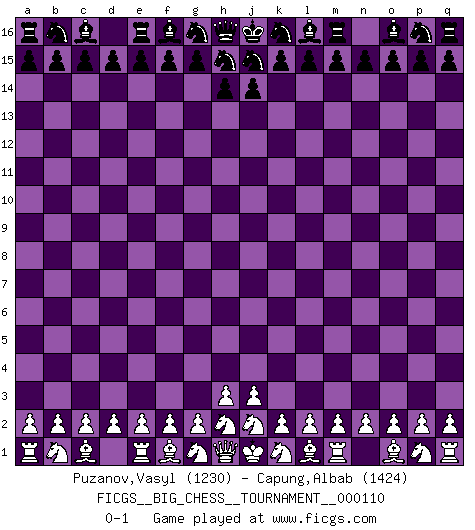 Last move : 0-1 2018 April 17 21:9:3 [Event "FICGS__BIG_CHESS__TOURNAMENT__000110"] [Site "FICGS"] [Date "2018.03.18"] [Round "1"] [White "Puzanov,Vasyl"] [Black "Capung,Albab"] [Result "0-1"] [WhiteElo "1230"] [BlackElo "1424"] 0-1 This big chess game has been lost on time (started : 2018.03.18 16:28:38) Follow this game move after move (download)Dazzling combinations are for the many, shifting wood is for the few. (Georg Kieninger) Es ist wirklich schade, dass so viele Schachspieler nicht auf ihr Äußeres achten! (Alexandra Kosteniuk) Coloca el contenido del tablero de Ajedrez en un sombrero, agita las piezas vigorosamente, derrámalas en el tablero desde una altura de medio metro y así obtienes el estilo de Wilhelm Steinitz. (H. E. Bird) Les échecs c'est le défi de l'alpiniste, toujours plus haut, prêt à tout pour monter à l'assaut du Roi ennemi. Les échecs, c'est de la musique en mouvement, un ballet majestueux pour les yeux. C'est de la poésie composée par les fantômes du passé qui au même titre que Rimbaud ou Verlaine méritent notre admiration. Les échecs, c'est de la peinture ou le moindre mouvement modifie le tableau pour en faire un Picasso ou un Van Gogh. Les échecs, c'est tout et rien, c'est la vie et la mort. Jjulie33 sur le forum de France-Echecs. Computer Science is no more about computers than astronomy is about telescopes. (Edsger W. Dijkstra)