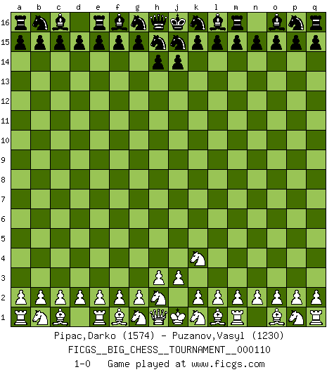 Last move : 1-0 2018 April 17 21:9:3 [Event "FICGS__BIG_CHESS__TOURNAMENT__000110"] [Site "FICGS"] [Date "2018.03.18"] [Round "1"] [White "Pipac,Darko"] [Black "Puzanov,Vasyl"] [Result "1-0"] [WhiteElo "1574"] [BlackElo "1230"] 1.j2-k4 1-0 This big chess game has been lost on time (started : 2018.03.18 16:28:38) Follow this game move after move (download)That's what Chess is all about. One day you give your opponent a lesson, the next day he gives you one. (Bobby Fischer) Nur ein wirklich starker Spieler weiß wie schwach er spielt. (Savielly Grigorievitsch Tartakower) Los Peones son el alma de una partida de Ajedrez. (Francois Andre Danican Philidor) Les Echecs sont et restent toujours un combat, un combat intégral comme la boxe, la lutte ou un autre sport, et où il doit y avoir un vainqueur et un vaincu. (Joseph Emil Diemer) Pushing plastic is for the many, pushing virtual pieces is for the fewer, pushing wood is for the very few. (Normajean Yates)
