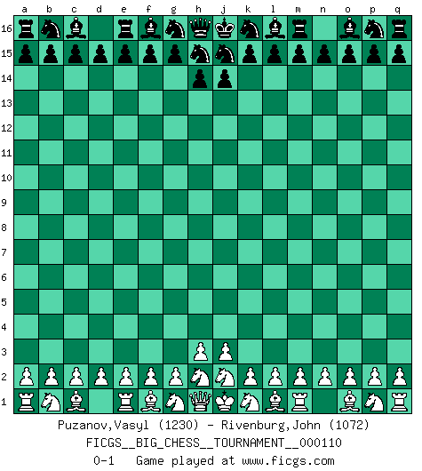 Last move : 0-1 2018 April 17 21:9:3 [Event "FICGS__BIG_CHESS__TOURNAMENT__000110"] [Site "FICGS"] [Date "2018.03.18"] [Round "1"] [White "Puzanov,Vasyl"] [Black "Rivenburg,John"] [Result "0-1"] [WhiteElo "1230"] [BlackElo "1072"] 0-1 This big chess game has been lost on time (started : 2018.03.18 16:28:38) Follow this game move after move (download)A big shock; the best chess player in history has passed away. (Lajos Portisch, about Bobby Fischer's death) Mein Gehirn das ist mein zweitwichtigstes Organ [Aus dem Film: Der Schläfer]. (Woody Allen) Las piezas de Ajedrez son los bloques del alfabeto que moldean los pensamientos; y esos pensamientos, aunque hagan un diseño visual en el tablero, expresan abstractamente su belleza como un poema. (Marcel Duchamp) La tactique, c'est ce que vous faites quand il y a quelque chose à faire; la stratégie, c'est ce que vous faites quand il n'y a rien à faire. (Savielli Tartacower) Every now and then a man's mind is stretched by a new idea and never shrinks back to its former dimensions. (Oliver Wendell Holmes, Sr.)