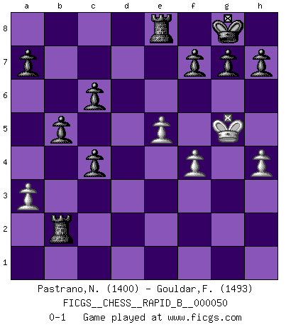 Last move : 0-1 2007 July 28 7:9:48 [Event "FICGS__CHESS__RAPID_B__000050"] [Site "FICGS"] [Date "2007.04.30"] [Round "1"] [White "Pastrano,Nicolas"] [Black "Gouldar,Frances"] [Result "0-1"] [WhiteElo "1400"] [BlackElo "1493"] 1.e4 e5 2.Nf3 Nc6 3.Bc4 Bc5 4.c3 Nf6 5.O-O Nxe4 6.d4 exd4 7.Re1 d5 8.cxd4 Bb4 9.Nc3 O-O 10.Bd2 Nxd2 11.Qxd2 dxc4 12.a3 Bxc3 13.Qxc3 Be6 14.Rad1 b5 15.Rd2 Bd5 16.Ne5 Re8 17.Rde2 Nxe5 18.dxe5 c6 19.f4 Qb6+ 20.Kh1 Rad8 21.Rd1 Bxg2+ 22.Kxg2 Rxd1 23.Rd2 Qg1+ 24.Kh3 Qf1+ 25.Kh4 Qe1+ 26.Kg5 Qxd2 27.Qxd2 Rxd2 28.h4 Rxb2 0-1 This chess game has been lost on time (started : 2007.04.30 18:29:53) Giuoco Piano Kingside Castling by player White (move 5) Kingside Castling by player Black (move 9) Player Black won this chess game. Follow this game move after move (download)When you don't know what to do, wait for your opponent to get an idea - it's sure to be wrong. (Tarrasch) Auf jeden Fall musst du zuerst Rechtsanwalt werden, damit du deine eigenen Interessen und die deiner Familie vertreten kannst. [Brief an seinen Sohn] (José Raúl Capablanca) Creo que una cierta cantidad de temperamento es esperada de los genios del Ajedrez. (Ron Gross) La victoire dans une partie d'Echecs appartient la plupart du temps à celui qui voit un peu plus loin que l'adversaire. (Lasker) Crush them ! Make them suffer ! (General Grievous in Star Wars ep.3)