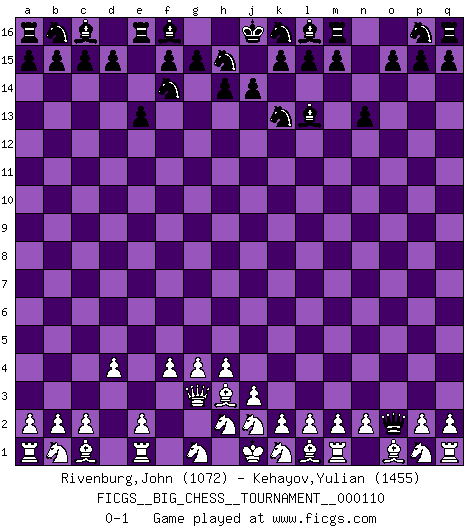 Last move : 0-1 2018 April 27 9:59:35 [Event "FICGS__BIG_CHESS__TOURNAMENT__000110"] [Site "FICGS"] [Date "2018.03.18"] [Round "1"] [White "Rivenburg,John"] [Black "Kehayov,Yulian"] [Result "0-1"] [WhiteElo "1072"] [BlackElo "1455"] 1.g2-g4 j15-k13 2.h3-h4 n15-n13 3.f1-h3 h16-o10 4.h1-f3 g16-f14 5.f3-g3 o16-l13 6.f2-f4 e15-e13 7.d2-d4 o10-o2 0-1 This big chess game has been lost on time (started : 2018.03.18 16:28:38) Follow this game move after move (download)I still hope to kill Fischer. (Boris Spassky) Die Arbeit ist etwas Unnatürliches. Die Faulheit allein ist göttlich. (Anatole France) En la vida, como en el Ajedrez, los Peones propios obstruyen nuestro camino. La gran fortuna de un hombre, su comodidad, placer, hijos, libros, que deberían ayudarle a ganar, con mucha frecuencia lo ponen en Jaque Mate. (Charles Buxton) Un millionnaire : 'Monsieur Steinitz ! Vous ne participez aux tournois que pour l'argent, alors que moi je n'y viens que pour l'honneur.' Steinitz : 'Chacun joue pour ce qu'il n'a pas'... You must have a dream in order to have it come true. (A.P.J. Kalam)