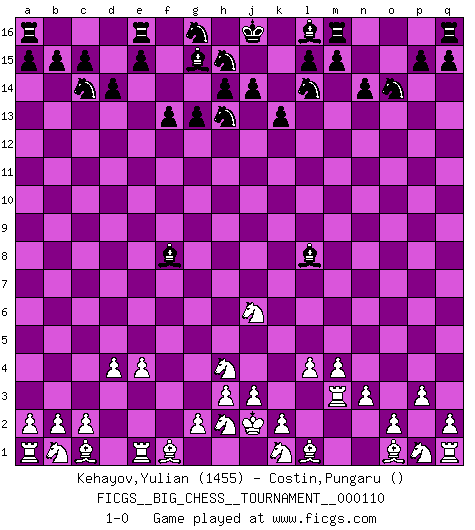 Last move : 1-0 2018 May 17 11:25:44 [Event "FICGS__BIG_CHESS__TOURNAMENT__000110"] [Site "FICGS"] [Date "2018.03.18"] [Round "1"] [White "Kehayov,Yulian"] [Black "Costin,Pungaru"] [Result "1-0"] [WhiteElo "1455"] [BlackElo ""] 1.j2-k4 k16-l14 2.h1-o7 j15-h13 3.o7-o15 p16-o14 4.o15-c4 b16-c14 5.d2-d4 n15-n14 6.e2-e4 g15-g13 7.l2-l4 h16-o10 8.p2-p3 o10-f2 9.g1-f3 f2-k6 10.n2-n3 o16-f8 11.c4-j10 d15-d14 12.j10-j6 k6-j6 13.k4-j6 c16-l8 14.f3-h4 k15-k13 15.m2-m4 f16-g15 16.j1-j2 f15-f13 17.m1-m3 1-0 This big chess game has been lost on time (started : 2018.03.18 16:28:38) Follow this game move after move (download)Chess is in its essence a game, in its form an art, and in its execution a science. (Baron Tassilo) Zum Sieg gelangt man nicht, wenn man gut, sondern nur wenn man besser spielt (Savielly Grigorievitsch Tartakower) Si pudieramos observar el interior de la cabeza de un jugador de Ajedrez, encontraríamos ahí un mundo lleno de sentimientos, imágenes, ideas, emoción y pasión. (Alfred Binet) On croit qu'il y a plus de mauvais joueurs que de bons joueurs, c'est faux : Il y a autant de joueurs qui gagnent que de joueurs qui perdent. (Philippe Geluck) The general who wins the battle makes many calculations in his temple before the battle is fought. The general who loses makes but few calculations beforehand. (Sun Tzu)