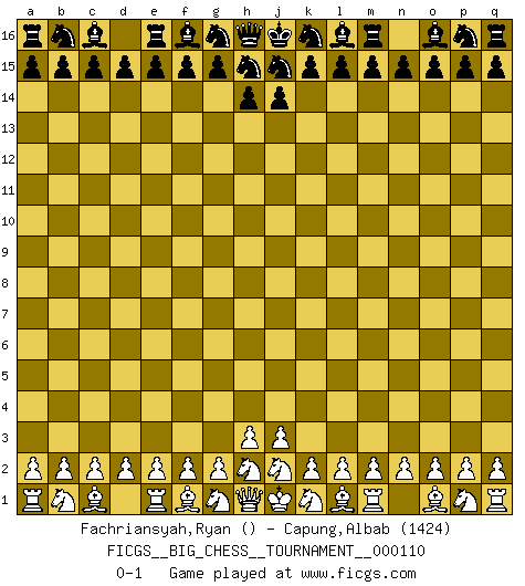 Last move : 0-1 2018 April 17 21:9:3 [Event "FICGS__BIG_CHESS__TOURNAMENT__000110"] [Site "FICGS"] [Date "2018.03.18"] [Round "1"] [White "Fachriansyah,Ryan"] [Black "Capung,Albab"] [Result "0-1"] [WhiteElo ""] [BlackElo "1424"] 0-1 This big chess game has been lost on time (started : 2018.03.18 16:28:38) Follow this game move after move (download)If your opponent offers you a draw, try to work out why he thinks he's worse off. (Nigel Short) Ich habe die Schachforschung dermaßen betrieben, dass sie auf eine wissenschaftliche Basis gestellt wurde. (Mikhail Moiseyevich Botvinik) Cuando tu casa esta en llamas, no puedes ser molestado por tus vecinos. O, como decinos en Ajedrez, si tu Rey esta bajo ataque, no te preocupa perder un Peón del lado de la Reina. (Gary Kasparov) La menace est plus forte que l'exécution. (Aaron Nimzovitch) Creativity involves breaking out of established patterns in order to look at things in a different way. (Edward De Bono)