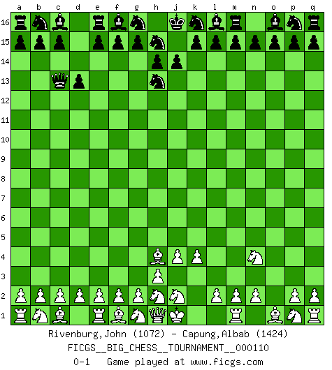 Last move : 0-1 2018 April 25 21:57:53 [Event "FICGS__BIG_CHESS__TOURNAMENT__000110"] [Site "FICGS"] [Date "2018.03.18"] [Round "1"] [White "Rivenburg,John"] [Black "Capung,Albab"] [Result "0-1"] [WhiteElo "1072"] [BlackElo "1424"] 1.k2-k4 j15-h13 2.j3-j4 h16-o10 3.l1-h4 o10-o2 4.k1-l3 d15-d13 5.l3-n4 o2-c13 0-1 This big chess game has been lost on time (started : 2018.03.18 16:28:38) Follow this game move after move (download)Some sacrifices are sound; the rest are mine. (Mikhail Tal) Man gibt nur Pakete auf. (Paul Keres) Nunca nadie ha ganado una partida de Ajedrez rindiendose. (Unknown) Les ravages du H expliquent la différence de niveau entre Tal et Thal [Abergel]. God, you are such an idiot. - Actually, I thought I was more of a jerk. (Gregory House to Stacy Warner, House M.D.)