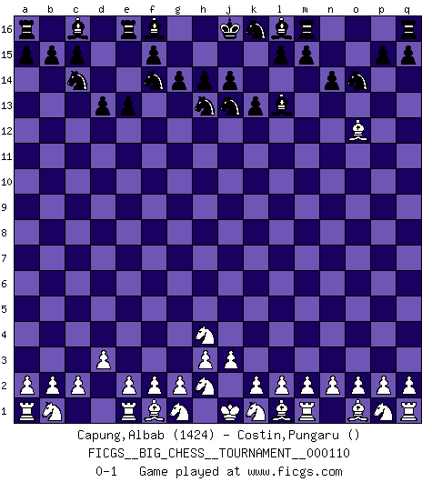 Last move : 0-1 2018 May 22 23:48:54 [Event "FICGS__BIG_CHESS__TOURNAMENT__000110"] [Site "FICGS"] [Date "2018.03.18"] [Round "1"] [White "Capung,Albab"] [Black "Costin,Pungaru"] [Result "0-1"] [WhiteElo "1424"] [BlackElo ""] 1.j2-h4 g16-f14 2.h1-o7 g15-g14 3.o7-o15 p16-o14 4.o15-c4 b16-c14 5.d2-d3 k15-k13 6.c4-c5 n15-n14 7.c5-c12 d15-d13 8.c12-f12 e15-e13 9.f12-g11 h15-j13 10.c1-o12 j15-h13 11.g11-l7 h16-l13 12.l7-l13 o16-l13 0-1 This big chess game has been lost on time (started : 2018.03.18 16:28:38) Follow this game move after move (download)Excellence at Chess is one mark of a scheming mind. (Sir Arthur Conan Doyle) Es gibt Leute, die glauben, alles wäre vernünftig, was man mit einem ernsthaften Gesicht tut. (Georg Christoph Lichtenberg) Un mal día en el Ajedrez, es mejor que cualquier buen día en el trabajo. (Anonymous) Les échecs sont utiles à l'exercice de la faculté de penser et à celle de l'imagination. Car nous devons posséder une méthode élaborée pour atteindre des buts partout où nous devons conduire notre raison. (Leibnitz) Big Chess is a place for big hallucinations. (Thibault de Vassal)