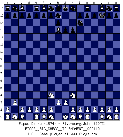 Last move : 1-0 2018 April 24 9:50:30 [Event "FICGS__BIG_CHESS__TOURNAMENT__000110"] [Site "FICGS"] [Date "2018.03.18"] [Round "1"] [White "Pipac,Darko"] [Black "Rivenburg,John"] [Result "1-0"] [WhiteElo "1574"] [BlackElo "1072"] 1.j2-k4 k15-k13 2.h2-g4 j14-j13 3.h1-o7 l16-h13 4.o7-o15 j15-l14 5.b2-b3 1-0 This big chess game has been lost on time (started : 2018.03.18 16:28:38) Follow this game move after move (download)Chess is a foolish expedient for making idle people believe they are doing something very clever when they are only wasting their time. (George Bernard Shaw) Du musst Deinen Gegner in einen tiefen dunklen Wald führen wo 2+2=5 ist und wo der Weg, der wieder hinausführt, nur breit genug für einen ist. (Mikhail Nekhemyevich Tal) Sin errores no puede haber brillantez. (Emanuel Lasker) Une platitude souvent récitée à propos des Echecs est qu'une des choses les plus difficiles à réaliser est de gagner une position gagnante. Cela ne manque pas de sens mais, pour ma part, j'ai toujours trouvé plus difficile de gagner une position perdante. (Tim Krabbe) Logic : The art of thinking and reasoning in strict accordance with the limitations and incapacities of the human misunderstanding. (Ambrose Bierce)