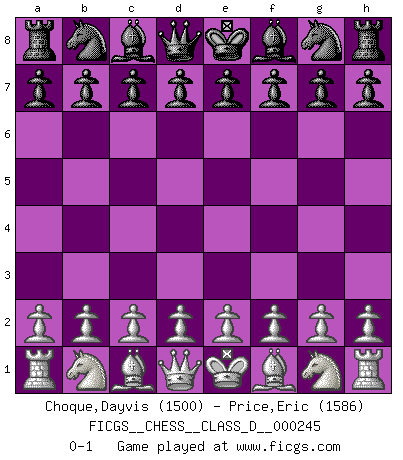 Last move : 0-1 2018 April 28 10:4:38 [Event "FICGS__CHESS__CLASS_D__000245"] [Site "FICGS"] [Date "2018.03.18"] [Round "1"] [White "Choque,Dayvis"] [Black "Price,Eric"] [Result "0-1"] [WhiteElo "1500"] [BlackElo "1586"] 0-1 This chess game has been lost on time (started : 2018.03.18 23:50:57) Player Black won this chess game. Follow this game move after move (download)Any material change in a position must come about by mate, a capture, or a Pawn promotion. (Purdy) Wenn ich einen Club besuche, sind die Spieler stumm vor Staunen. (José Raúl Capablanca) Combinaciones deslumbrantes son para la mayoría, mover madera es para los pocos. (Georg Kieninger) Ce qui est bien, c'est d'avoir tout un tas de pièces en prise : l'adversaire ne peut en prendre qu'une à la fois. Cité par Thierry Audin. Computers have lots of memory but no imagination. (Anonymous)