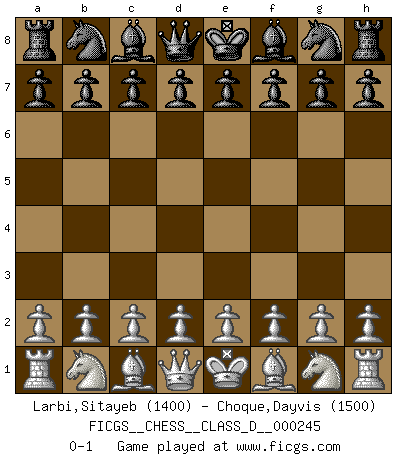 Last move : 0-1 2018 April 28 10:4:38 [Event "FICGS__CHESS__CLASS_D__000245"] [Site "FICGS"] [Date "2018.03.18"] [Round "1"] [White "Larbi,Sitayeb"] [Black "Choque,Dayvis"] [Result "0-1"] [WhiteElo "1400"] [BlackElo "1500"] 0-1 This chess game has been lost on time (started : 2018.03.18 23:50:57) Player Black won this chess game. Follow this game move after move (download)Nowadays, when you're not a grandmaster at 14, you can forget about it. (Anand Viswanathan) Wenn Spassky eine Figur opfert kannst du genauso gut aufgeben. Aber wenn Tal eine Figur opfert, spiel weiter. Er könnte noch eine weitere opfern, und dann ... wer weiß? (Miguel Najdorf) Bendita sea la memoria de aquel que dio al mundo este juego inmortal. (A. G. Gardiner) Toutes choses étant égales, c'est la conviction qui gagne. Alliée à une volonté de vaincre, elle sert de détonateur, suscite des idées, disperse les doutes et aide à penser clairement. (Robert Fischer) Men should grow up. - Yeah. And dogs should stop licking themselves. It's not gonna happen. (Gregory House to Dr. Cameron, House M.D.)