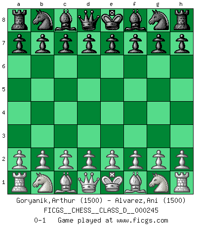 Last move : 0-1 2018 April 28 10:4:38 [Event "FICGS__CHESS__CLASS_D__000245"] [Site "FICGS"] [Date "2018.03.18"] [Round "1"] [White "Goryanik,Arthur"] [Black "Alvarez,Ani"] [Result "0-1"] [WhiteElo "1500"] [BlackElo "1500"] 0-1 This chess game has been lost on time (started : 2018.03.18 23:50:57) Player Black won this chess game. Follow this game move after move (download)It is peculiar but a fact nevertheless, that gamblers in chess always have enthusiastic followers. (Botvinnik) Die FIDE ist dabei in die Hände der russischen Mafia zu fallen. (Larry Evans) A través de las casillas del tablero, los Indios explican el movimiento del tiempo y la edad, las influencias mas altas que controlan el mundo y los lazos que vinculan al Ajedrez con el alma humana. (Al-Masudi) Nous vivons dans un monde échiquéen : chaque jour qui passe est un défi à relever. (Philosophe Sasha) We're missing something. (Gregory House, House M.D.)
