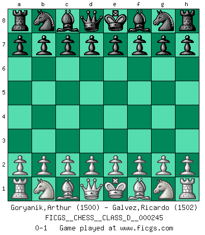 Last move : 0-1 2018 April 28 10:4:38 [Event "FICGS__CHESS__CLASS_D__000245"] [Site "FICGS"] [Date "2018.03.18"] [Round "1"] [White "Goryanik,Arthur"] [Black "Galvez,Ricardo"] [Result "0-1"] [WhiteElo "1500"] [BlackElo "1502"] 0-1 This chess game has been lost on time (started : 2018.03.18 23:50:57) Player Black won this chess game. Follow this game move after move (download)The essence of Chess is thinking about what Chess is. (David Bronstein) Obendrein hat der FIDE-Präsident den Revolutionsführer Gaddafi zum »Großmeister« ernannt, am Ende der WM. Das ist lächerlich! (Joel Lautier) Un juego de Ajedrez es un dialogo, una conversación entre un jugador y su oponente. Cada movimiento del oponente puede contener amenazas o tropiezos, pero un jugador no se puede defender de las amenazas o tomar ventaja de los tropiezos si es que no se pregunta a sí mismo: ¿Que es lo que mi oponente va a hacer después de cada movida?. (Bruce A. Moon) On est toujours la mazette de quelqu'un d'autre. (Anonyme) You lose, general Kenobi. (General Grievous in Star Wars ep.3)