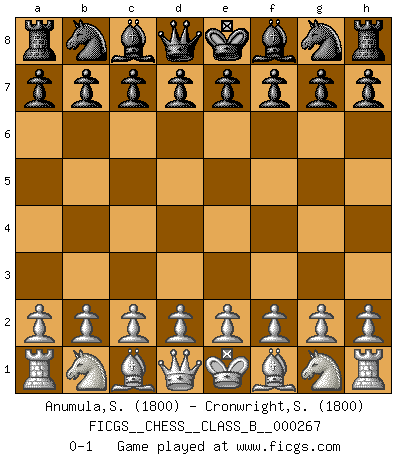 Last move : 0-1 2018 April 29 10:3:45 [Event "FICGS__CHESS__CLASS_B__000267"] [Site "FICGS"] [Date "2018.03.20"] [Round "1"] [White "Anumula,Siddhartha Vijay Raj"] [Black "Cronwright,Shaun"] [Result "0-1"] [WhiteElo "1800"] [BlackElo "1800"] 0-1 This chess game has been lost on time (started : 2018.03.20 2:22:54) Player Black won this chess game. Follow this game move after move (download)A man that will take back a move at Chess will pick a pocket. (Richard Fenton) Die Leute spielen gegen mich seit 15 Jahren unter Ihren Möglichkeiten. (Robert James Fischer) Si el ingenio solamente fuese necesario para lucirse, las mujeres serían las mejores jugadoras de Ajedrez del mundo. (Albin) Même si vous avez un bon coup à faire, regardez toujours s'il n'y en a pas un qui lui soit préférable. (Pedro Damiano) A good teacher is like a candle - it consumes itself to light the way for others. (Author unknown)