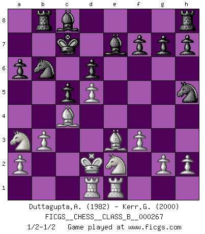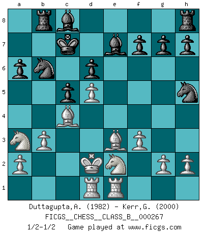 Last move : 1/2-1/2 2018 June 17 9:29:5 [Event "FICGS__CHESS__CLASS_B__000267"] [Site "FICGS"] [Date "2018.03.20"] [Round "1"] [White "Duttagupta,Aniruddha"] [Black "Kerr,Graham"] [Result "1/2-1/2"] [WhiteElo "1982"] [BlackElo "2000"] 1.d4 Nf6 2.Bg5 Ne4 3.Bf4 c5 4.f3 Qa5+ 5.c3 Nf6 6.d5 e6 7.e4 exd5 8.exd5 d6 9.Qd2 Be7 10.c4 Qxd2+ 11.Kxd2 b5 12.Nc3 Nh5 13.Be3 bxc4 14.Nb5 Kd8 15.Bxc4 Nd7 16.Ne2 a6 17.Na3 Rb8 18.b3 Nb6 19.Rad1 Kc7 20.Rhe1 1/2-1/2 Trompowsky attack (Ruth, Opovcensky Opening) This chess game ended in a draw. Follow this game move after move (download)Fischer is the strongest player in the world. In fact, the strongest player who ever lived. (Larry Evans) Wie bekannt hörte Morphy 1859 auf, Schach zu spielen. Seine Enttäuschung galt nicht so sehr dem Schach, wie den Schachspielern. (Robert James Fischer) Bobby solo arroja las piezas y solas caen en las casillas correctas. (Miguel Najdorf ) 'L'échange des dames est un coup dur pour les deux adversaires...' Un journaliste lors d'une partie du match Spassky-Fischer The only difference between a tax man and a taxidermist is that the taxidermist leaves the skin. (Mark Twain)