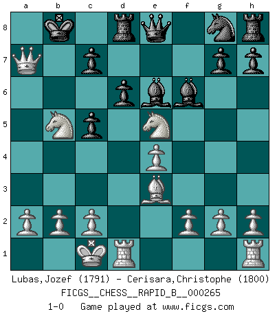 Last move : 1-0 2018 March 24 21:4:44 [Event "FICGS__CHESS__RAPID_B__000265"] [Site "FICGS"] [Date "2018.03.20"] [Round "1"] [White "Lubas,Jozef"] [Black "Cerisara,Christophe"] [Result "1-0"] [WhiteElo "1791"] [BlackElo "1800"] 1.e4 e5 2.Nf3 d6 3.d4 Be7 4.dxe5 Be6 5.Nc3 Nc6 6.Bb5 Qd7 7.Bf4 O-O-O 8.Qe2 f6 9.O-O-O fxe5 10.Nxe5 Qe8 11.Bxc6 bxc6 12.Qa6+ Kb8 13.Be3 c5 14.Nb5 Bf6 15.Qxa7+ 1-0 Philidor's defense Queenside Castling by player Black (move 7) Queenside Castling by player White (move 9) Player White won this chess game. Follow this game move after move (download)That's what Chess is all about. One day you give your opponent a lesson, the next day he gives you one. (Bobby Fischer) Schach ist Krieg, im Schach geht es um testosterongesteuerte Urschreie. (Garry Kasparov) Yo he agregado estos principios a la ley: pongan los Caballos en acción antes de que los dos Alfiles sean desarrollados. (Emanuel Lasker) Il a essayé de se convaincre qu'il pourrait empêcher toutes les erreurs et ne jamais perdre. L'horreur ! Gary Kasparov au sujet de Robert Fischer. The age of a woman doesn't mean a thing. The best tunes are played on the oldest fiddles. (Ralph Waldo Emerson)