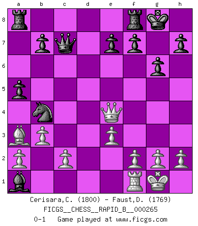 Last move : 0-1 2018 April 9 23:57:28 [Event "FICGS__CHESS__RAPID_B__000265"] [Site "FICGS"] [Date "2018.03.20"] [Round "1"] [White "Cerisara,Christophe"] [Black "Faust,Dieter"] [Result "0-1"] [WhiteElo "1800"] [BlackElo "1769"] 1.d4 Nf6 2.Nf3 g6 3.e3 Bg7 4.Bd3 d5 5.O-O O-O 6.Nc3 Bg4 7.b3 c5 8.dxc5 Bxf3 9.Qxf3 Ne4 10.Bxe4 dxe4 11.Qxe4 Bxc3 12.Rb1 Qc7 13.Ba3 a5 14.c6 Nxc6 15.Rbd1 Nb4 16.Ra1 Bxa1 0-1 King's Indian : East Indian defense Kingside Castling by player White (move 5) Kingside Castling by player Black (move 5) Player Black won this chess game. Follow this game move after move (download)Your body has to be in top condition. Your Chess deteriorates as your body does. You can't separate body from mind. (Bobby Fischer) Es gibt keine einzige Frau, der ich nicht einen Springer vorgeben könnte und trotzdem gewänne. (Robert James Fischer) El Ajedrez es la vida. (Bobby Fischer) Même un GMI sait rarement calculer sur plus de cinq coups une attaque à sacrifices. (Rudolf Spielmann) Fear is the path to the dark side. Fear leads to anger; anger leads to hate; hate leads to suffering. I sense much fear in you. (Master Yoda in Star Wars ep.1)