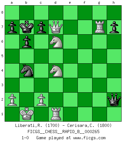Last move : 1-0 2018 April 9 12:25:8 [Event "FICGS__CHESS__RAPID_B__000265"] [Site "FICGS"] [Date "2018.03.20"] [Round "1"] [White "Liberati,Riccardo"] [Black "Cerisara,Christophe"] [Result "1-0"] [WhiteElo "1700"] [BlackElo "1800"] 1.e4 e5 2.Nf3 d6 3.d4 Nf6 4.dxe5 Nxe4 5.Bc4 Be6 6.Bxe6 fxe6 7.exd6 Bxd6 8.Qe2 Nc5 9.Be3 Nba6 10.Nc3 Qf6 11.O-O-O O-O-O 12.Qc4 Rd7 13.Kb1 Rhd8 14.Bg5 Qf5 15.Bxd8 Rxd8 16.b4 Nxb4 17.Qxb4 Na6 18.Qc4 Nb4 19.Nd4 Qxf2 20.Ne4 Qxg2 21.Qxe6+ Rd7 22.Rhg1 Qxh2 23.Rxg7 b6 24.Qxd7+ Kb7 25.Nxd6+ 1-0 Philidor : Nimzovich variation Queenside Castling by player White (move 11) Queenside Castling by player Black (move 11) Player White won this chess game. Follow this game move after move (download)Chess is the gymnasium of the mind. (Blaise Pascal) Ich habe Kasparov in Rente geschickt. (Veselin Topalov) Todo se encuentra en un estado de flujo y esto incluye al mundo del Ajedrez. (Mikhail Botvinnik) Psychologiquement, tu dois avoir confiance en toi même, mais cette confiance doit être basée sur des faits. (Robert Fischer) Do you know these so called Volunteers don't even get paid! (Simpsons)