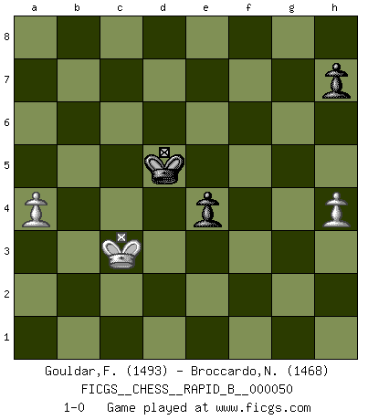 Last move : 1-0 2007 July 18 17:58:19 [Event "FICGS__CHESS__RAPID_B__000050"] [Site "FICGS"] [Date "2007.04.30"] [Round "1"] [White "Gouldar,Frances"] [Black "Broccardo,Nicola"] [Result "1-0"] [WhiteElo "1493"] [BlackElo "1468"] 1.e4 d6 2.d4 Nf6 3.Nc3 g6 4.Be3 c6 5.Qd2 b5 6.Bd3 Nbd7 7.Nf3 Bg7 8.O-O-O O-O 9.Bh6 b4 10.Ne2 Bxh6 11.Qxh6 e5 12.Qd2 d5 13.Ng3 exd4 14.Nxd4 c5 15.Nc6 Qb6 16.Ne7+ Kh8 17.Nxd5 Nxd5 18.exd5 Bb7 19.Bc4 Ne5 20.Qe2 Qf6 21.f3 Qf4+ 22.Kb1 Nxc4 23.Ne4 Ba6 24.Qe1 Qe5 25.c3 Rab8 26.Nxc5 Qxe1 27.Rhxe1 bxc3 28.b3 Na3+ 29.Kc1 Bb5 30.d6 c2 31.Rd4 Rfe8 32.Rde4 Red8 33.Rd4 Rbc8 34.b4 a5 35.Nb7 Re8 36.Rxe8+ Rxe8 37.Re4 Rxe4 38.fxe4 axb4 39.Nc5 Nc4 40.d7 Bxd7 41.Nxd7 Ne3 42.Nb6 Nxg2 43.Nd5 f5 44.exf5 gxf5 45.Nxb4 Ne3 46.a4 Nc4 47.Kxc2 Na5 48.Kc3 Kg7 49.Nd3 Nc6 50.Kc4 Kf6 51.Kc5 Na5 52.Kb5 Nb7 53.Kb6 Nd6 54.Kc6 Nc4 55.Nb2 Na5+ 56.Kb5 Nb3 57.Nd3 Nd4+ 58.Kb6 Nb3 59.Nc5 Nd2 60.Kb5 Ne4 61.Nxe4+ fxe4 62.Kc4 Ke5 63.Kc3 Kd5 64.h4 1-0 Pirc : 150 attack Queenside Castling by player White (move 8) Kingside Castling by player Black (move 8) 10 pieces endgame at move 44 : White KNPP , Black KNPPPP WHITE : King + 1 Knight 2 Pawns BLACK : King + 1 Knight 4 Pawns 9 pieces endgame at move 45 : White KNPP , Black KNPPP WHITE : King + 1 Knight 2 Pawns BLACK : King + 1 Knight 3 Pawns 8 pieces endgame at move 47 : White KNPP , Black KNPP WHITE : King + 1 Knight 2 Pawns BLACK : King + 1 Knight 2 Pawns 7 pieces endgame at move 61 : White KNPP , Black KPP WHITE : King + 1 Knight 2 Pawns BLACK : King + 2 Pawns 6 pieces endgame at move 61 : White KPP , Black KPP WHITE : King + 2 Pawns BLACK : King + 2 Pawns Player White won this chess game. Follow this game move after move (download)Checkers is for tramps. (Paul Morphy) Weshalb minderdergeübte Spieler mit g2-g4 beginnen? Die betreffenden sind unschlüssig, ob sie nun rechts (h4) oder links (f4) beginnen sollen, und in ihrer Ratlosigkeit entschliessen sie sich nach guter Bürgerart dazu, den goldenen Mittelweg zu wählen. (Aaron Nimzowitsch) El Ajedrez es sobre todo, ¡una pelea!. (Emanuel Lasker) Psychologiquement, tu dois avoir confiance en toi même, mais cette confiance doit être basée sur des faits. (Robert Fischer) Thus, what is of supreme importance in war is to attack the enemy's strategy. (Sun Tzu)