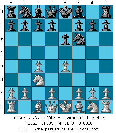 Last move : 1-0 2007 June 6 0:24:34 [Event "FICGS__CHESS__RAPID_B__000050"] [Site "FICGS"] [Date "2007.04.30"] [Round "1"] [White "Broccardo,Nicola"] [Black "Grammenos,Nikos"] [Result "1-0"] [WhiteElo "1468"] [BlackElo "1400"] 1.c4 Nf6 2.Nc3 e6 3.e4 1-0 This chess game has been lost on time (started : 2007.04.30 18:29:53) English : Mikenas-Carls variation Player White won this chess game. Follow this game move after move (download)Chess is so inspiring that I do not believe a good player is capable of having an evil thought during the game. (Wilhelm Steinitz) Intelligenz läßt sich nicht am Weg, sondern nur am Ergebnis feststellen. (Garry Kasparov) Cuando veas una buena jugada, trata de encontrar otra mejor. (Emanuel Lasker) Il vaut toujours mieux jouer un plan faux de façon logique que de n'avoir pas de plan du tout. (Victor Kortchnoï) The absolute truth is the thing that makes people laugh. (Carl Reiner)